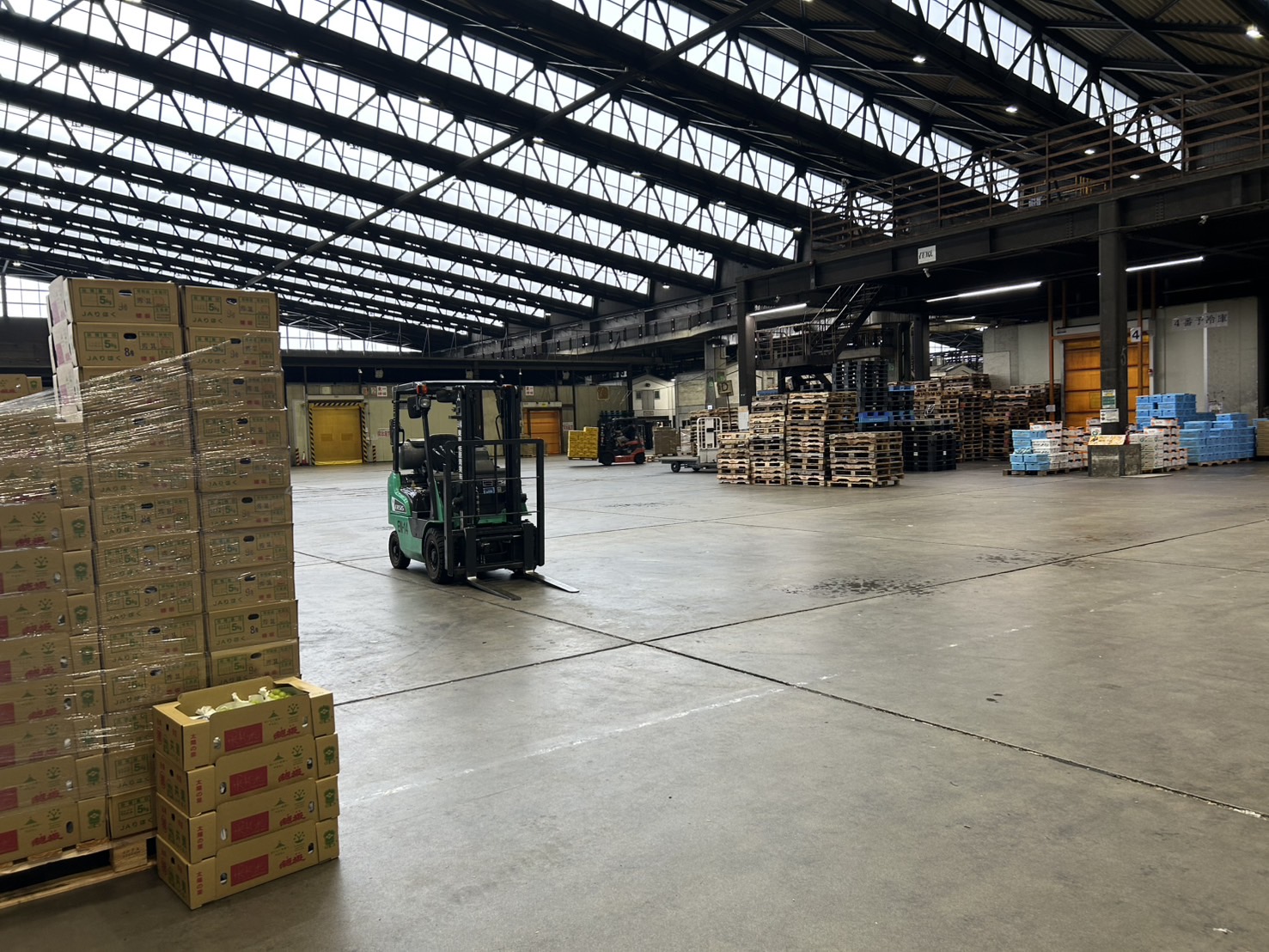 市場に運ばれてくる青果物の荷受け、仕分け、検品、整理具体的には、トラックから商品を市場内に降ろします。仲間やドライバーさんと協力し皆で対応します。また、降ろした商品と伝票の数量が合っているか検品作業もございます。 カウンターフォークを使って青果物の運搬と整理